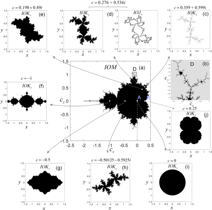 Depending on your hardware and your browser, this may take more or less time. We have noticed, for instance (end of 2025), that on the Firefox browser, the computations are quite a bit faster than on the Chrome browser. Riding the Mandelbus(credit: the term and idea of the 'Mandelbus' came from a 1989 paper by A.K. Dewdney) To follow the trajectory of a point (complex number) through its steps, first click the Mandelbus button, then select a point (complex number) by clicking a location on the surface (step 0). The browser will compute the result for step 1 and draw a (red) line from the result of step 0 to the result of step 1. Another click computes step 2 and connects the result of step 1 with that of step 2, another one does step 3, etc. Thus, continued clicking displays the trajectory of the complex number you selected as you subject it to ever more steps. As long as the 'Mandelbus' remains in the area, you can continue to take steps. But once the bus escapes the neighborhood on its way to infinity, no more steps will be taken. At any time you can select the Reset button to reset the screen. If you try several points: some inside the Mandelbrot set, some outside the set (please Reset between trying points), you will notice that if you pick a point within the Mandelbrot set, the 'Mandelbus' remains in the area. Whereas if you pick a point outside the set (a point in the black space), the bus quickly escapes to infinity. You will also notice that as you pick points closer to the 'edge' of the Mandelbrot set, it takes more steps to decide if the bus remains in the neighborhood or will escape to infinity. This brings up an important question: Where exactly is the border of the Mandelbrot set?Does the Mandelbrot set have a border?Perhaps the most intriquing question associated with the Mandelbrot set is whether it has a border.We just saw that as we ride the Mandelbus with points close the set's border, ever more steps are required to decide if the point remains in the area or escapes to infinity. By default the maximum number of steps (iterations) is set to 100. Please play with this number; e.g., try 100 and 500 and study the differences in results (note: be patient; setting iterations to 500 significantly increases the number of computations needed to compute the set). What do we see? Well, the set seems to get a little larger when the max iterations is set to 100, and smaller when the max iterations is set to 500. There are also far larger grey areas in the 100-iterations set than in the 500-iterations set. Clearly then, it seems that if we increase the maximum number of steps (iterations), the border becomes less fuzzy; more precise. We can explore this further by zooming in on the set's border; i.e., we take a small area near the set's border and 'blow it up' to look at the details inside. To do this, first Reset the page. Then, with your mouse, click and drag a small rectangle area somewhere that includes a section of the set's border; then select Plot. You may also want to combine this with larger numbers of iterations. We will observe a few things: Beauty bonus: Julia setsThe trip into beautiful complexity of numbers does not stop here. The Mandelbrot set is tightly connected with another type of set: the so-called Julia set named after the French mathematician Gaston Julia. Wheras there is only a single Mandelbrot set, each complex number has its own Julia set. Julia sets are computed using the same steps as the ones used in the Mandelbrot set, but instead of checking all the numbers on the surface for escape from the surface, we now check all the numbers on the surface for escape from a specific point on the surface. Hence, each point (complex number) on the surface having its own Julia set. To generate Julia sets, first Reset the page; then select the Julia button; then click on a point on the Mandelbrot image surface. The Julia set associated with the point you selected will appear in a separate browser tab. Note that depending on how you pick the point for your Julia set, a Julia set can be fantastically complex and beautiful, or rather simple. Take a look at Julia examples to gain some idea of where interesting Julia sets can be found. Also, note that once you have a Julia set displayed, it is worth playing with the 'iterations number. Lowering or increasing the number of iterations used for computing a Julia set can dramatically increase the complexity and visual appeal of the set.